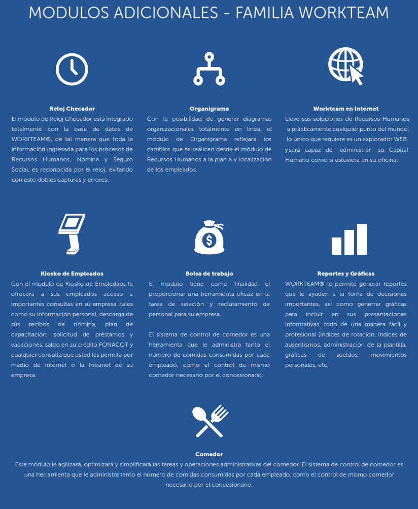 WORKTEAM® es un sistema de control y administración para el Capital Humano de las empresas, entendiendo este recurso como el valor más importante de una organización. La línea WORKTEAM® ofrece herramientas eficientes capaces de automatizar los procesos de Recursos Humanos.